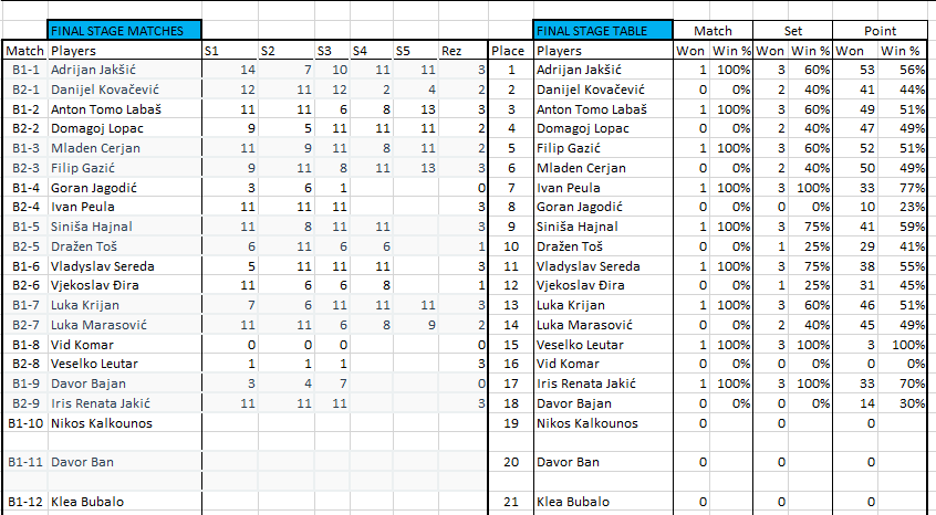 Pobjednik turnira je onaj koji pobjedi sve protivnike koji su bili prvi u svojim grupama. Igrat će se na 3 dobivena seta do 11 s lopticama koje će pripremiti organizator.
