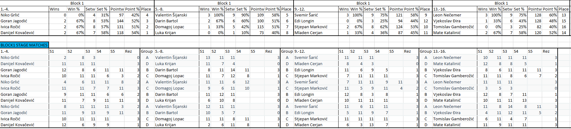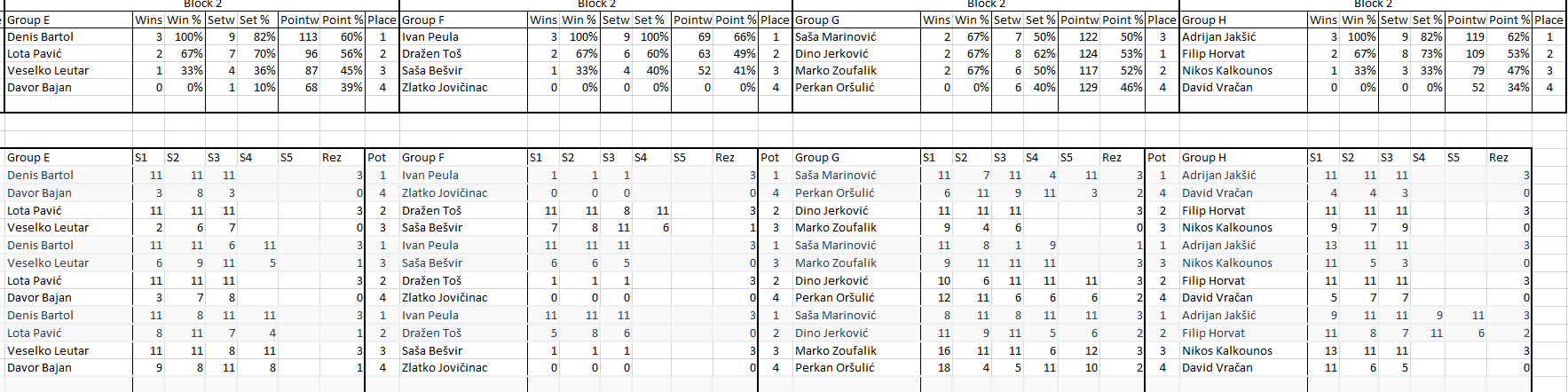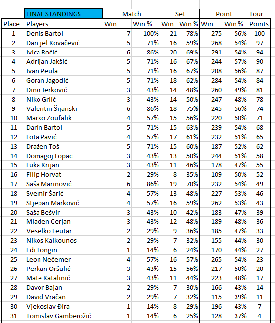 Pobjednik turnira je onaj koji pobjedi sve protivnike koji su bili prvi u svojim grupama. Igrat će se na 3 dobivena seta do 11 s lopticama koje će pripremiti organizator.