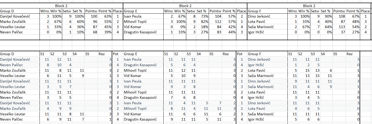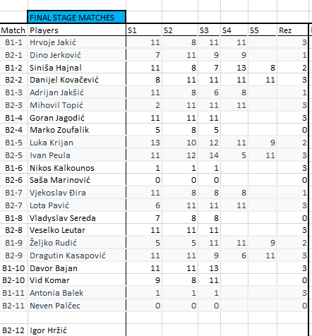 Pobjednik turnira je onaj koji pobjedi sve protivnike koji su bili prvi u svojim grupama. Igrat će se na 3 dobivena seta do 11 s lopticama koje će pripremiti organizator.